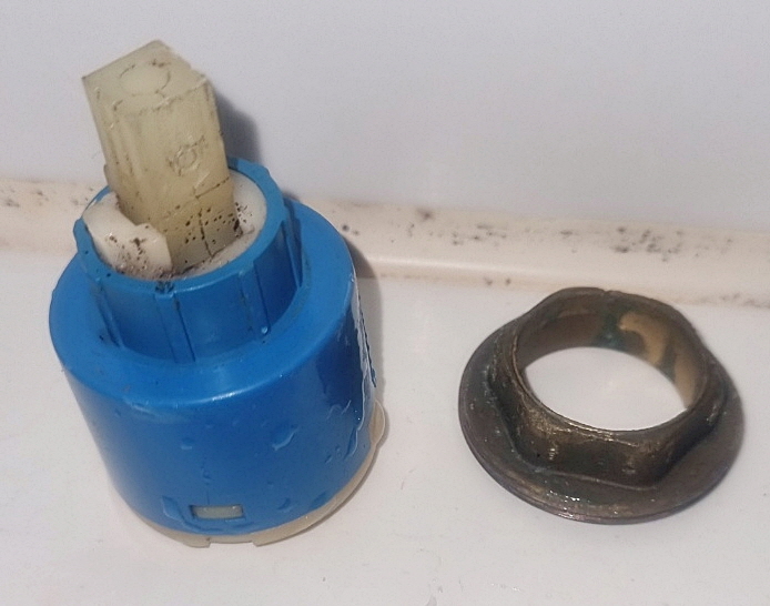 수전 카트리지와 고정용 27mm 볼트 입니다. 카트리지가 수명이 다한거 같이 오래 되긴 했습니다.