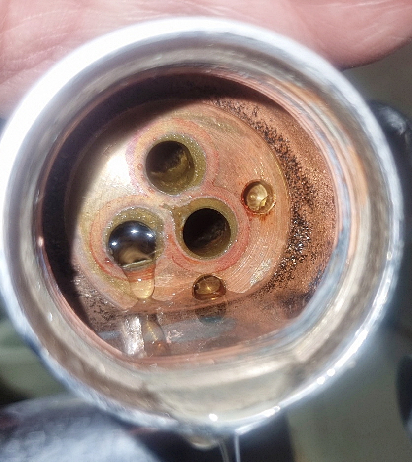 수전 내부 입니다. 구멍 세개가 있는데 하나는 온수, 하나는 냉수, 하나는 합쳐서 나가는 출수 나머지 작은 구멍 같은 홈은 수전카트리지 고정하는 홈 구멍 입니다.