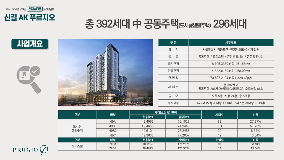 신길 AK 푸르지오 단지는 서울시 영등포구 신길동 255-9번지 일원에 공급합니다. 단지 규모는 지하 5층~지상 24층으로 총 5개 동으로 구성됩니다. 공동주택은 전용면적 기준으로 49㎡ 타입 총 296세대를 공급하고 있습니다. 타입은 총 4개 타입으로 49A 타입 83 가구, 49B1 타입 151 가구, 49B2 타입 20 가구, 49C 타입 42 가구로 공급합니다.