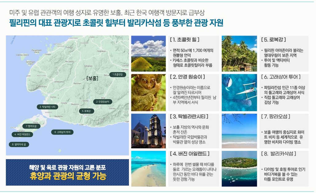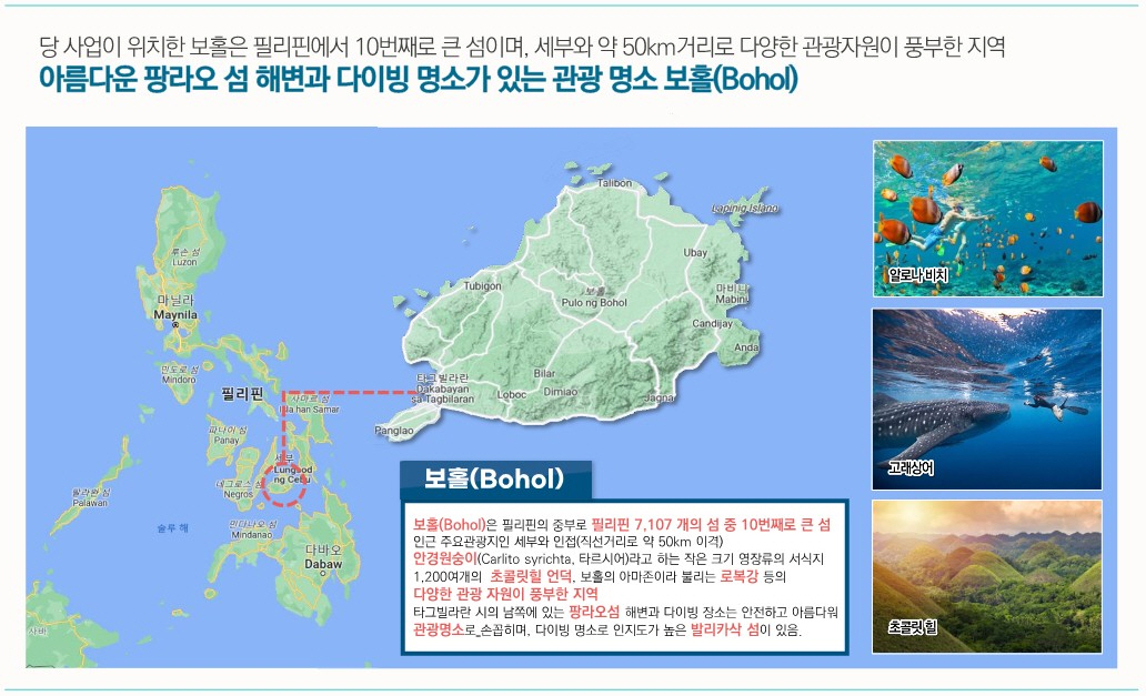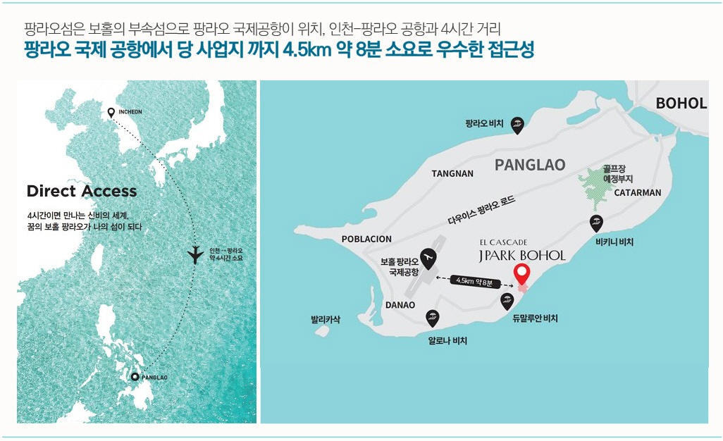 제이파크 보홀 리조트는 필리핀 보홀섬에 들어섭니다. 27개 홀 골프장과 1,353실 숙박시설(호텔 1,269실, 풀빌라 84실)로 필리핀 보홀섬 최대 규모의 워터파크 시설과 부대시설로 공급됩니다. 보홀섬은 부산 및 인천에서 직항 비행기로 4시간이면 도착이 가능해 교통환경도 매우 우수한 입지의 동남아 휴양지 섬입니다. 보홀섬 팡라오 국제공항에서 제이파크 보홀 리조트까지 약 4.5km 거리이며 차량으로 약 8분 정도 소요 되는 거리이며 현재 공사 중인 27개 홀 골프장까지는 차량으로 약 10분 정도 소요 됩니다.