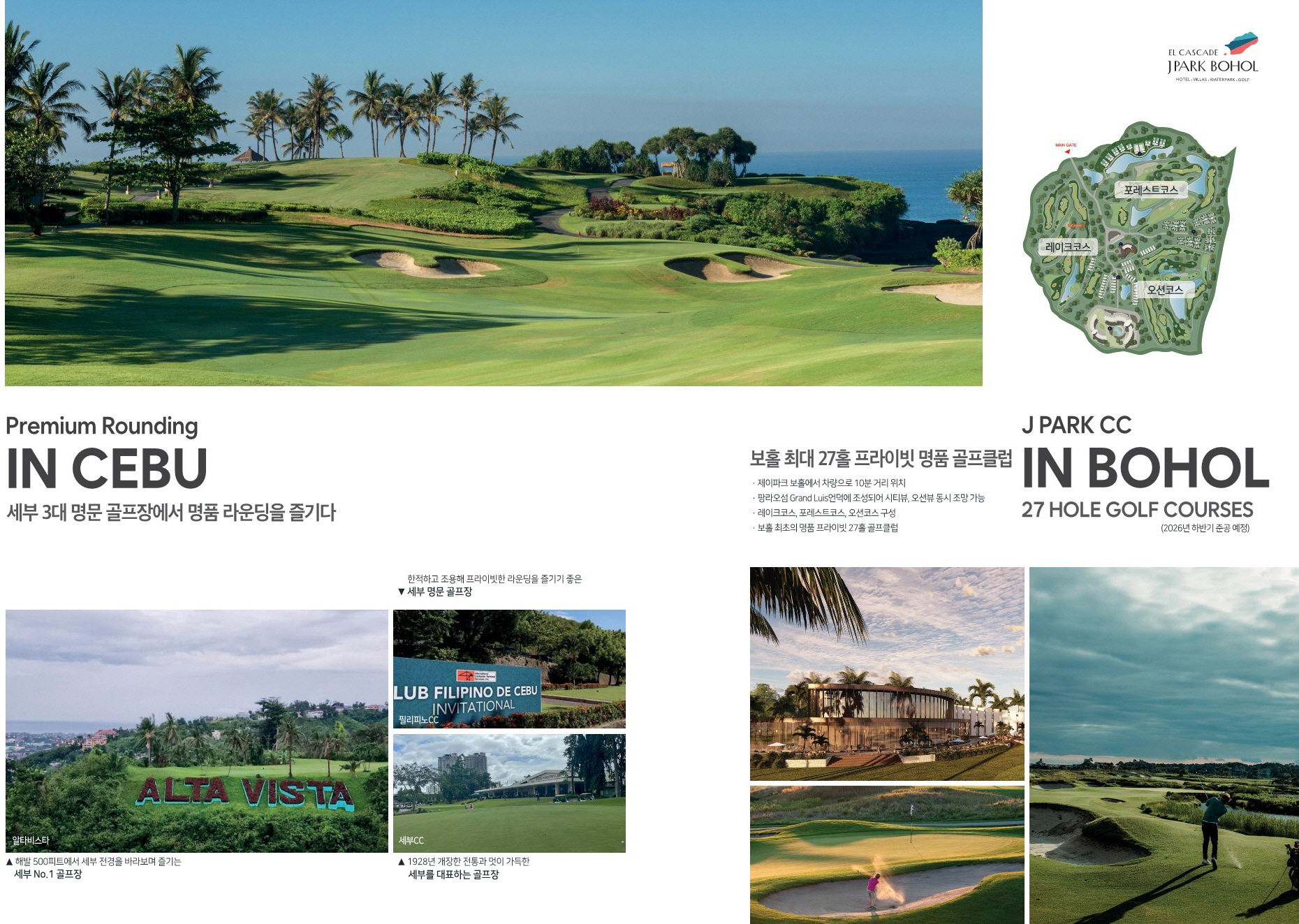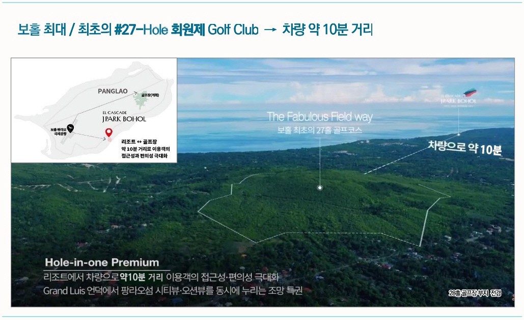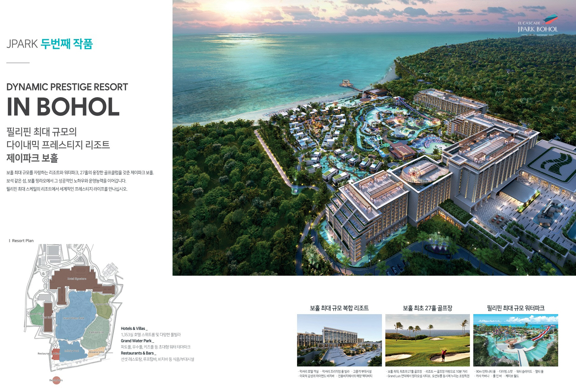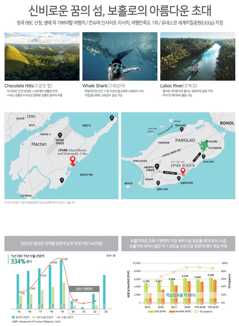 제이파크 보홀&세부 리조트는 동남아시아 3대 리조트로 필리핀 최대 규모의 워터파크와 보호홀섬에 처음 들어서는 27개 홀 골프장, 호텔, 풀빌라등으로 구성되어 2026년 10월에 준공 예정입니다.