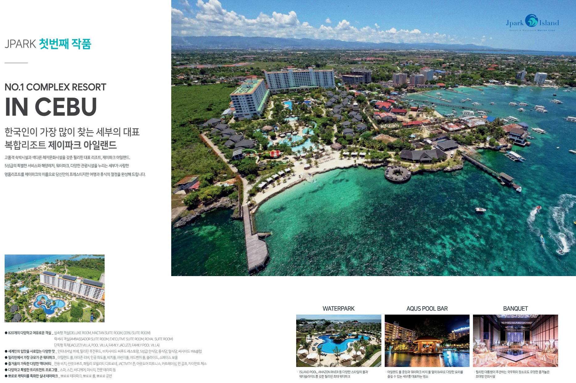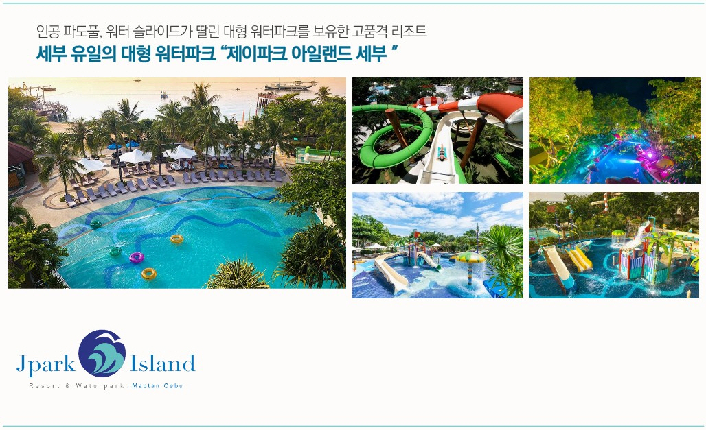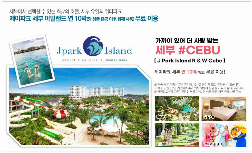 보홀섬에서 약 40km에 위치한 세부에 위치한 제이파크 아일랜드 리조트는 제이파크 보홀 리조트 분양권 계약과 동시에 사용이 가능합니다. 제이파크 아일랜드 리조트는 2009년 개장하여 객실 수 820실로 구성되어 있으며 워터파크와 액티비티, 뽀로로 테마파크, 각종 부대시설등이 있으며 제이파크 보홀 리조트 회원권으로 이용이 가능합니다.