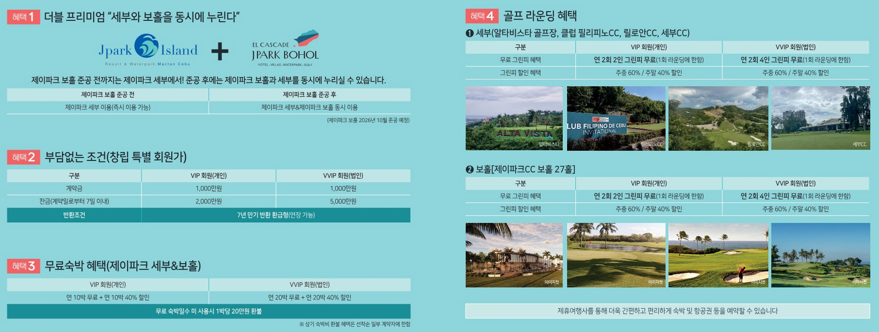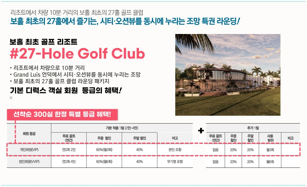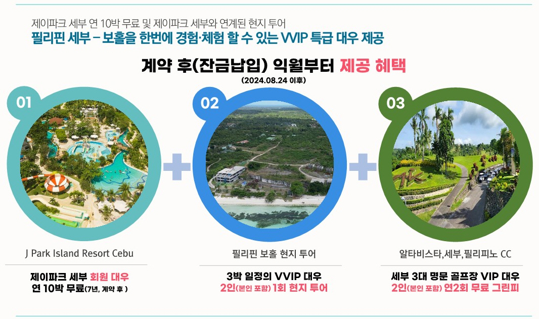 아래 슬라이드로 보시면 각종 제이파크 보홀 리조트 회원권 계약자 특별혜택을 만나 보실 수 있습니다.
