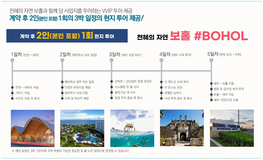 제이파크 보홀 리조트 회원권을 아주 특별한 조건으로 분양 중에 있습니다. 분양계약자 선착순 500분에게 3박 5일 제이파크 세부 및 보홀 리조트 투어 여행권을 증정합니다.